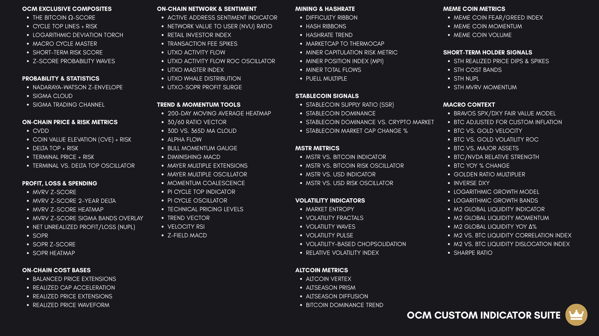 Custom Indicator Suite 📈 Custom Indicator SuiteUnlock the most powerful suite of Composites, On-Chain Metrics, Cycle Models, Risk & Macro Signals, Trend & Momentum tools, and more... On-Chain MindMay 19, 2025∙ Paid76688ShareCurrent Indicator List:🎬 Access Guide:Upgrade now — Get access to the Full Custom Indicator Suite on TradingView:SubscribeThis post is for paid subscribersSubscribeAlready a paid subscriber? Sign inPreviousNext