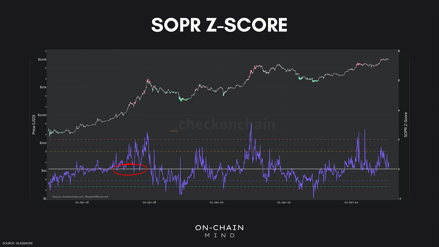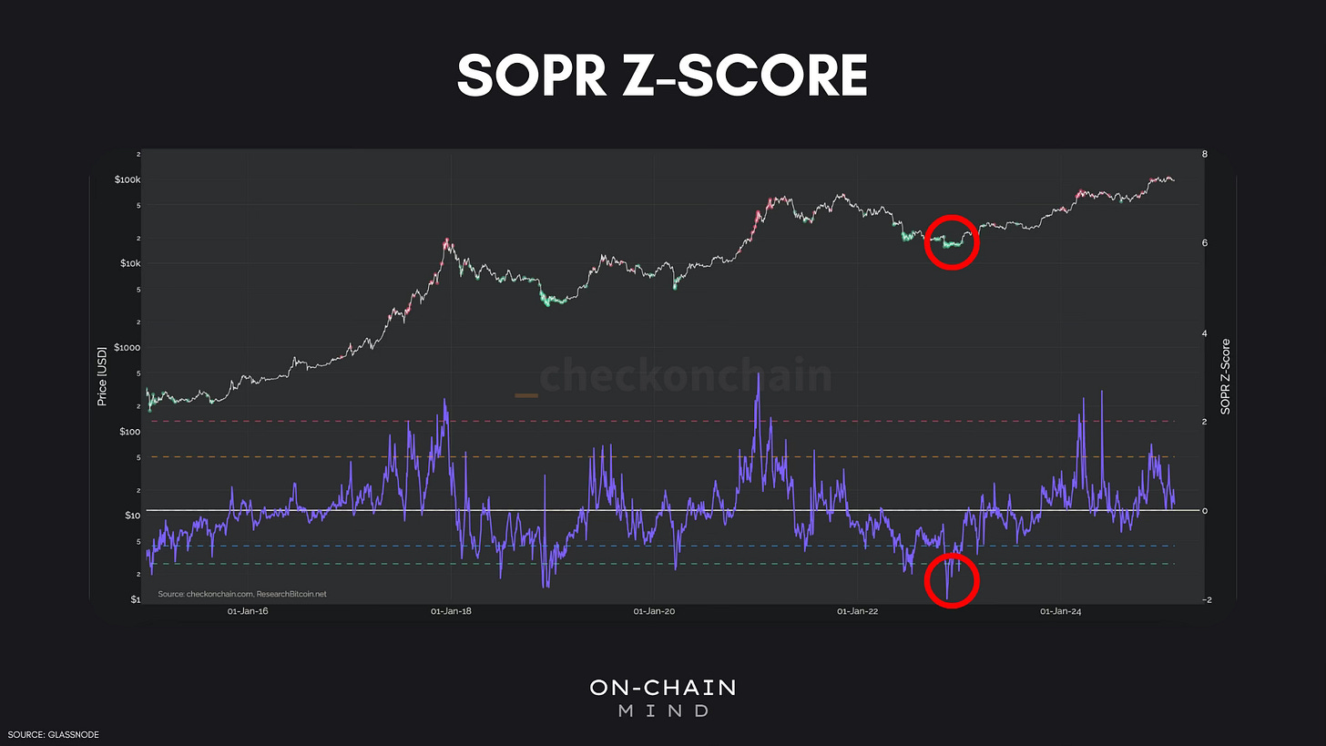 In bull markets, SOPR-Z often retests 0 as support, meaning investors are willing to buy the dip.