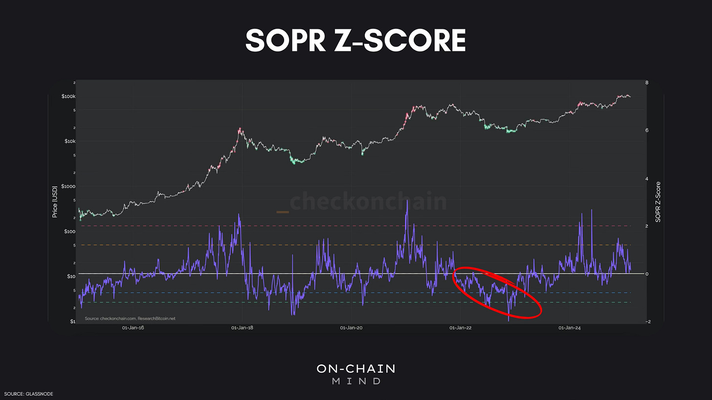 During 2022’s prolonged downturn, SOPR-Z struggled to rise above 0, showing persistent sell pressure.