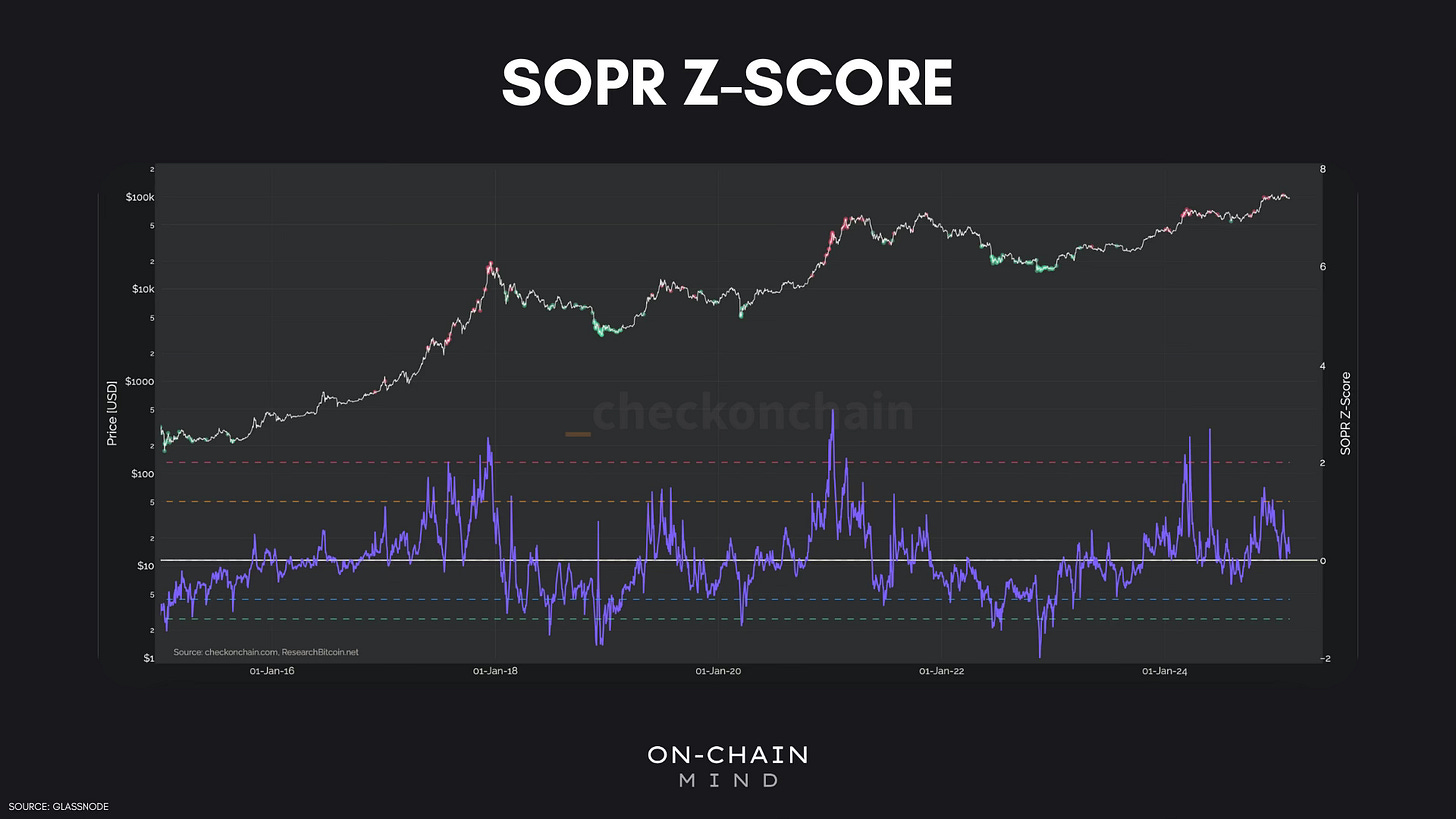 During bull markets, SOPR tends to remain above 0 on the z-score, as investors take profits but the market absorbs the selling.