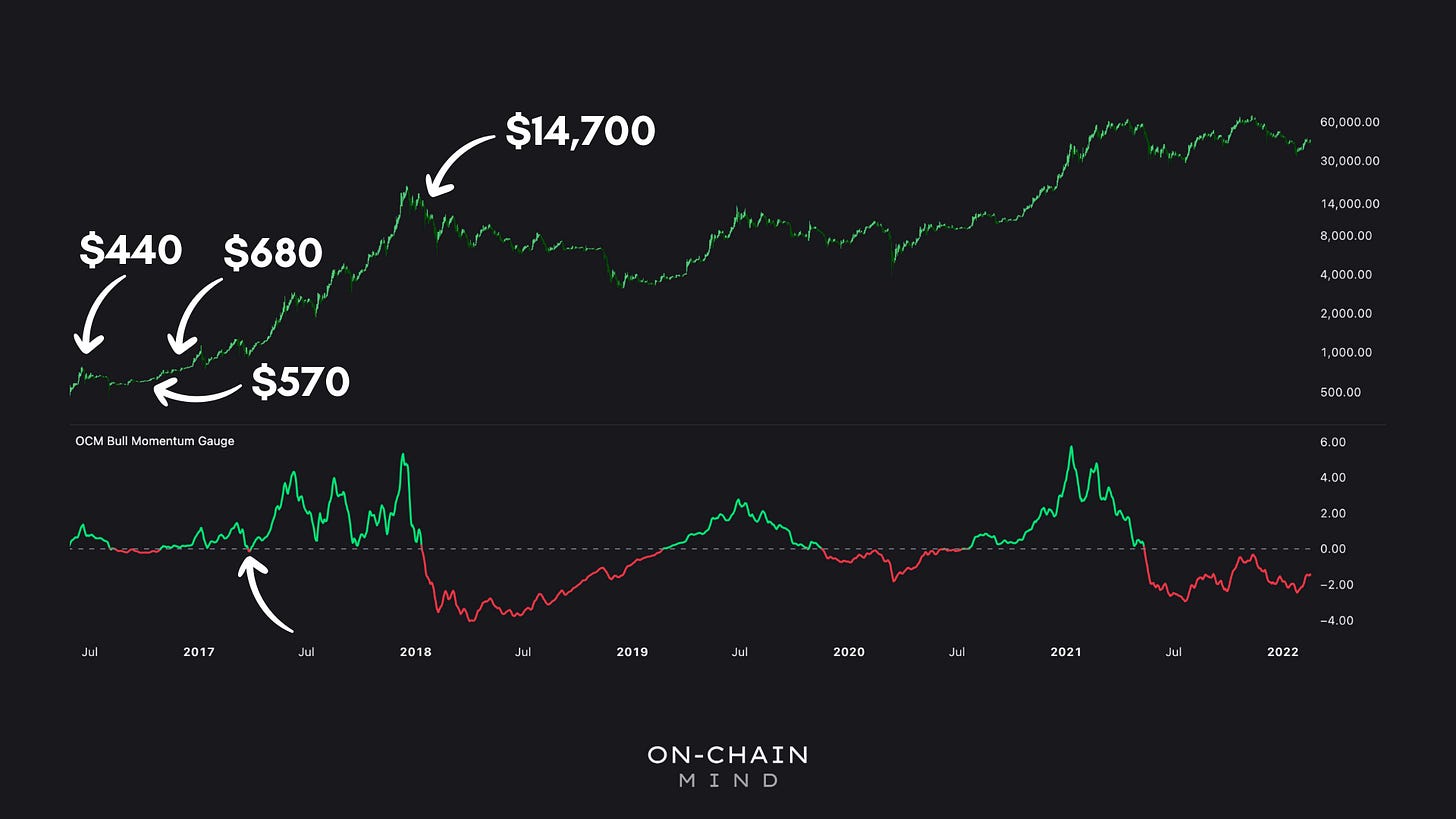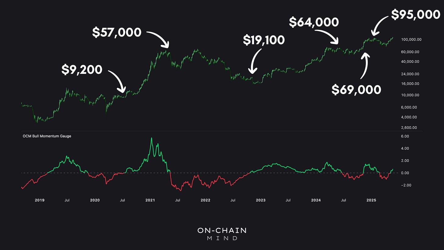 Today is an experiment. Rather than focusing on deep on-chain data or where we are in the macro cycle, we’re using a metric called the Bull Momentum Gauge to explore Bitcoin’s price patterns, and dive into the mechanics and psychology behind a momentum-based strategy. Instead of trying to estimate the market top and bottom, we’re going to follow a very simple, data-driven strategy, and see whether it outperforms buy-and-hold Bitcoin.
