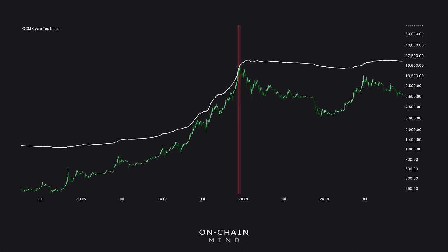 2021: Bitcoin touched the composite line multiple times, signalling overbought conditions before the crash.