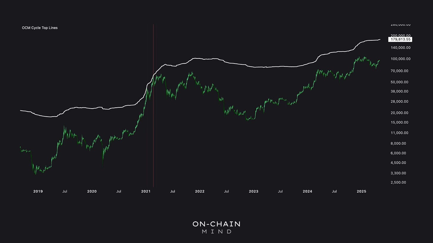 To navigate this divergence, we can use a composite average—a mean of all six indicators, currently sitting at $179,000. This white line on the chart below isn’t a crystal ball but a high-probability zone where a macro top might form. Historical data backs this up: